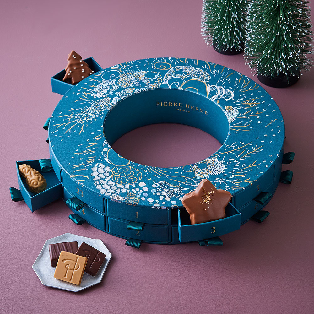 ピエール・エルメはこの円形のアドベントカレンダーがトレードマーク。今年は深海の魅力や環境問題をテーマに活動するアーティスト、コートニー・マティソンのコラボデザインのようです。落ち着いたブルーのボックスは目に入るたびに優雅な気分にさせてくれます。シックな雰囲気で、そっと置くだけでインテリアの一部になりそうです。